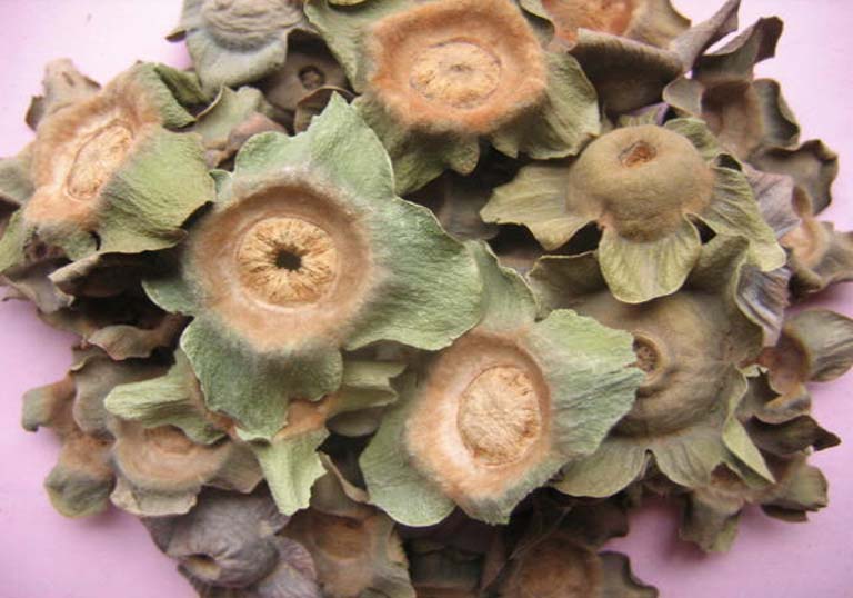 Dược liệu hình tròn dẹt, đường kính 1,5 cm đến 2,5 cm, ở giữa hơi dày, hơi nhô lên, có sẹo tròn của cuống quả đã rụng, mép tương đối mỏng, xẻ tư, phiến xẻ thường uốn cong lên, dễ gãy nát. Phần đáy còn cuống quả hoặc chỉ còn vết cuống quả, dạng lỗ tròn. Mặt ngoài màu vàng nâu hoặc nâu đỏ, mặt trong màu nâu vàng, phủ đáy lông nhung nhỏ. Chất cứng và giòn, không mùi, vị chát.